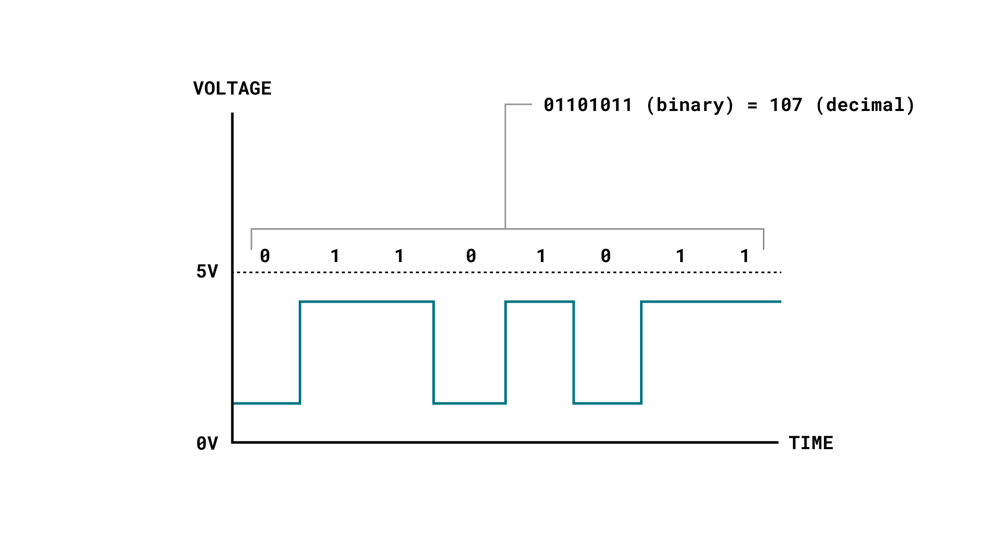 Digital signals might seem very basic (just 0 or 1), but are actually way more advanced. For example, we can create a sequence by sending a high or low state rapidly a number of times. This is known as a binary sequence or a bitstream.