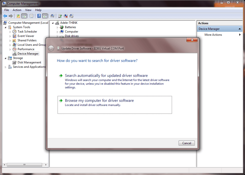 Windows (tested on XP, 7, Vista and 10) Connect the M0 Pro to your computer with a USB cable via the Programming port. Windows should initiate its driver installation process once the board is plugged in, but it won't be able to find the driver on its own. You'll have to tell it where the driver is. Click on the Start Menu and open the Control Panel Navigate to "System and Security". Click on System, and open the Device Manager. Look for the listing named "Ports (COM & LPT)". You should see an open port named "Arduino M0 Pro Prog. Port". Right click on the "Arduino M0 Pro Prog. Port" and choose "Update Driver Software".