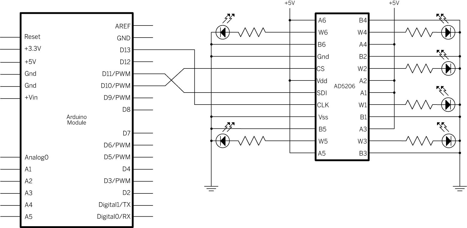 In this tutorial you will learn how to control the AD5206 digital potentiometer using Serial Peripheral Interface (SPI). For an explanation of SPI see the SPI Library reference.