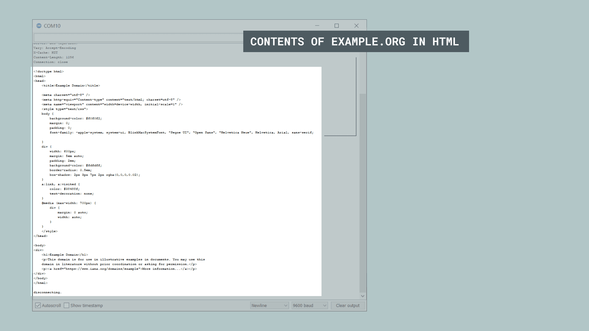 When it connects, it will then make a GET request to example.org. It basically downloads the contents, and prints it in the Serial Monitor. The result is that you can see the entire page in the Serial Monitor.